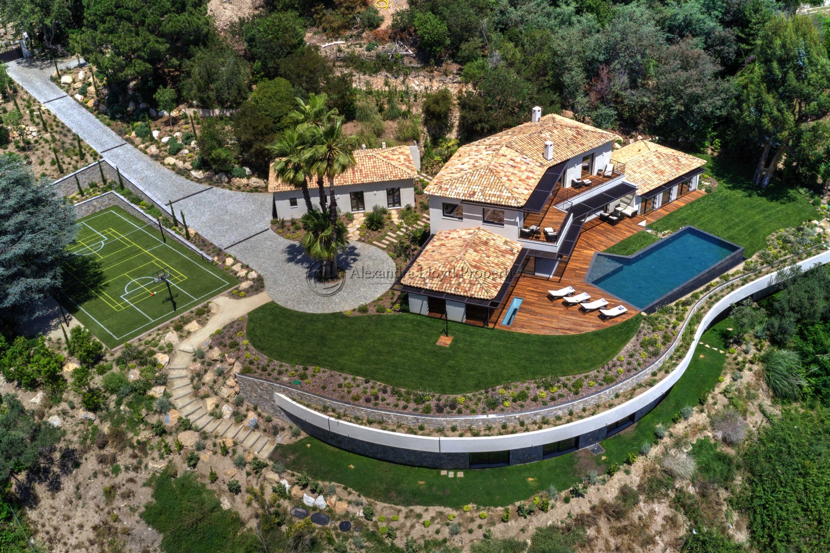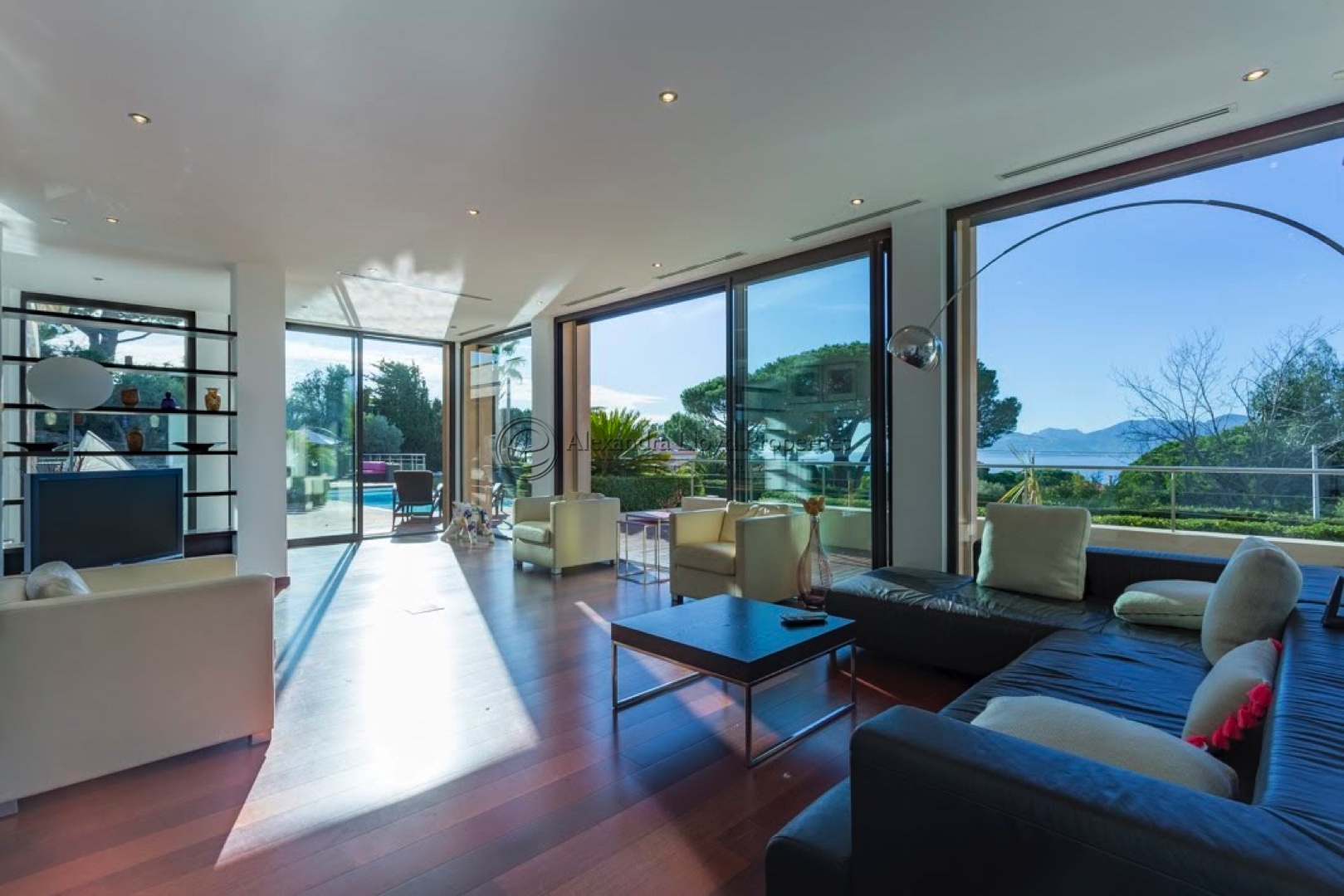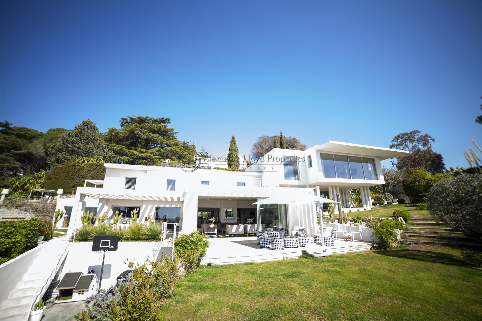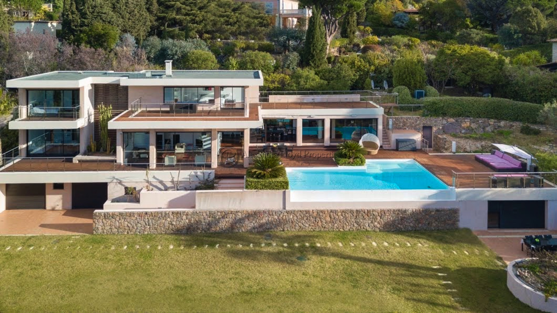 A wonderfully contemporary villa located in Super Cannes – amazing views over the Mediterranean sea, and the town of Cannes. Five ensuite bedrooms plus a staff house on grounds.