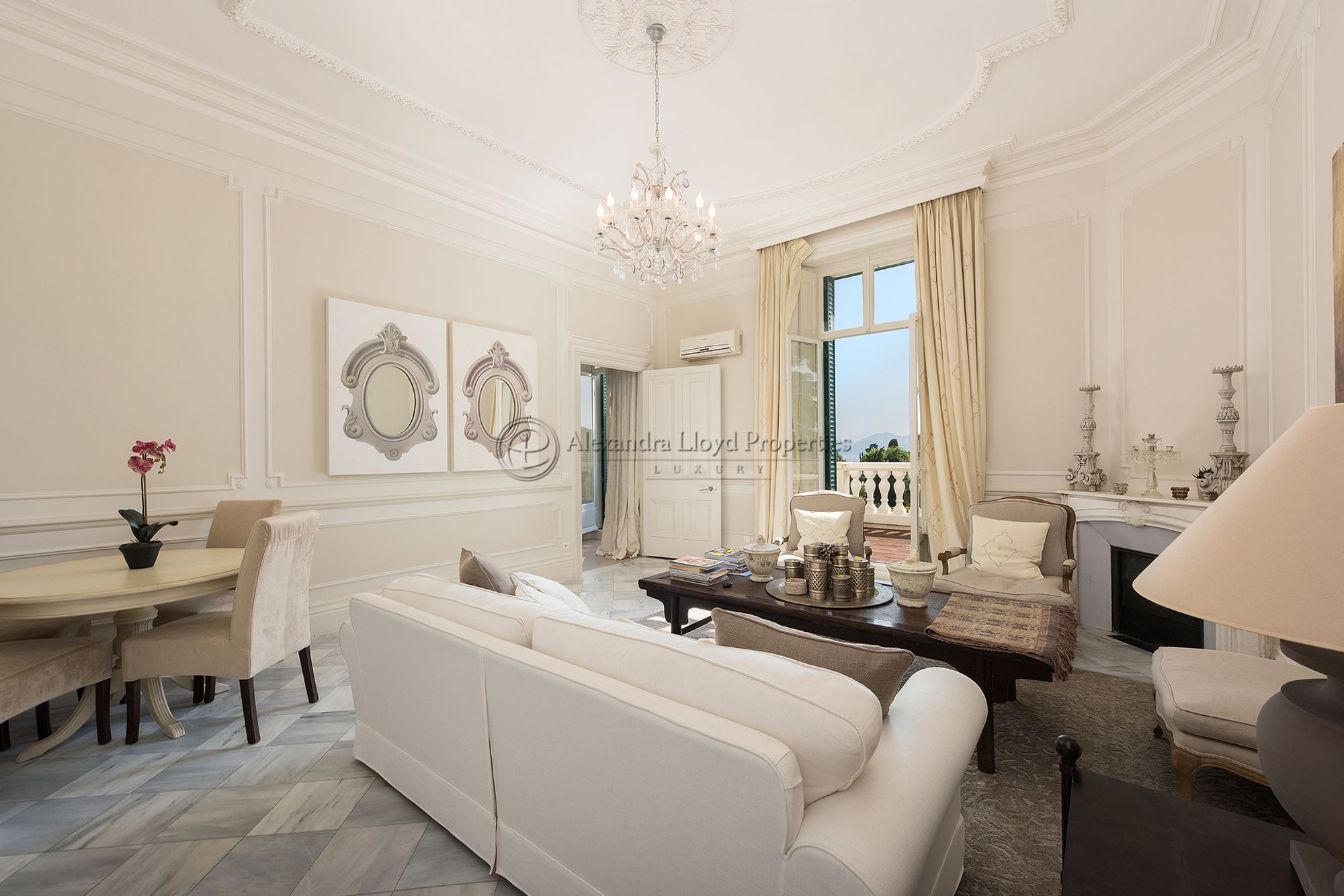 - Open living room with dining area, a decorative fireplace, and wonderful original ceiling markings of the Belle Epoque building
