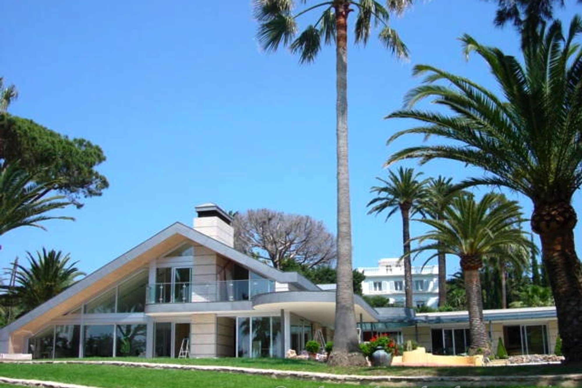 Villa for rent and for sale on the Cap d'Antibes. Fabulous modern waters edge villa, recently fully renovated on the Cap d'Antibes. Well located, just across from the beach and offering stunning views right over the Port Gallice to the Bay of Cannes. Set in wonderful well maintained grounds of 8000m² with exotic and palm trees. The property is of a Californian Bauhaus style, made from stone and zinc with 450m² of living space. Good quality modern furniture (Armarni Casa) and top of the range appliances (Miele and Gaggenau). All bathrooms are supplied by Bagno di Alessi. Seven bedrooms, each with their personal bathroom. Fully equipped kitchen with top of the range appliances. Heated swimming pool and Jacuzzi. Covered terraces and summer dining areas. Parking for 10 cars.