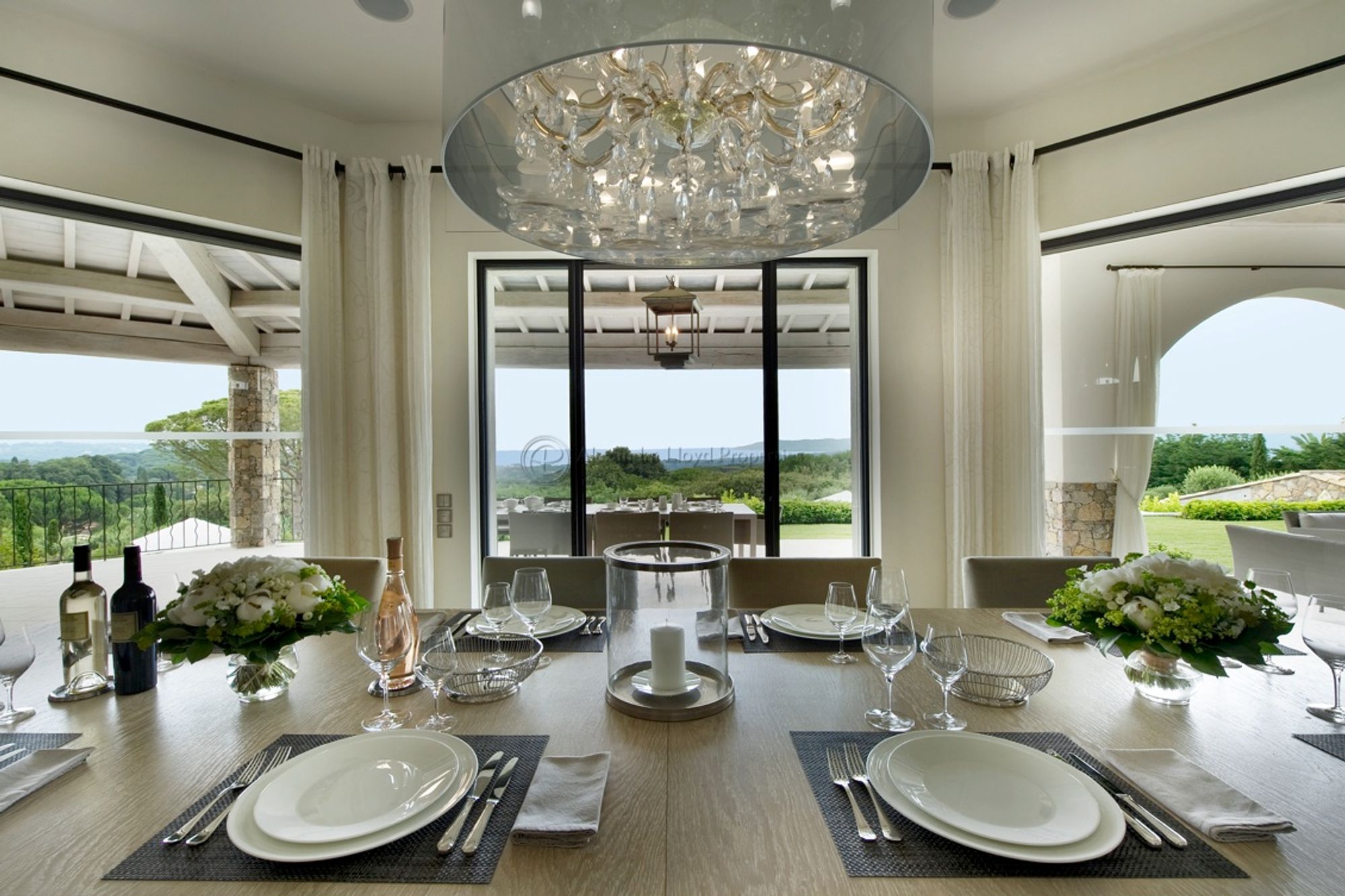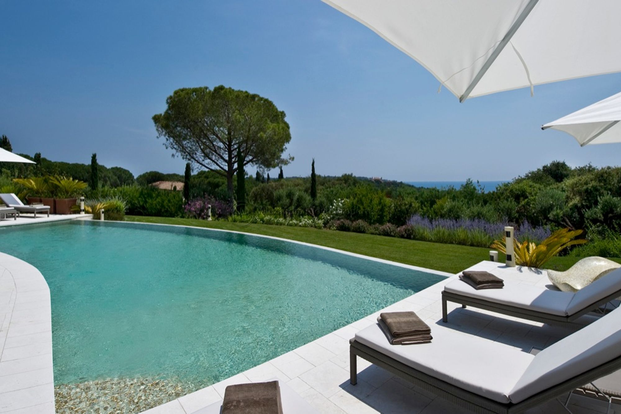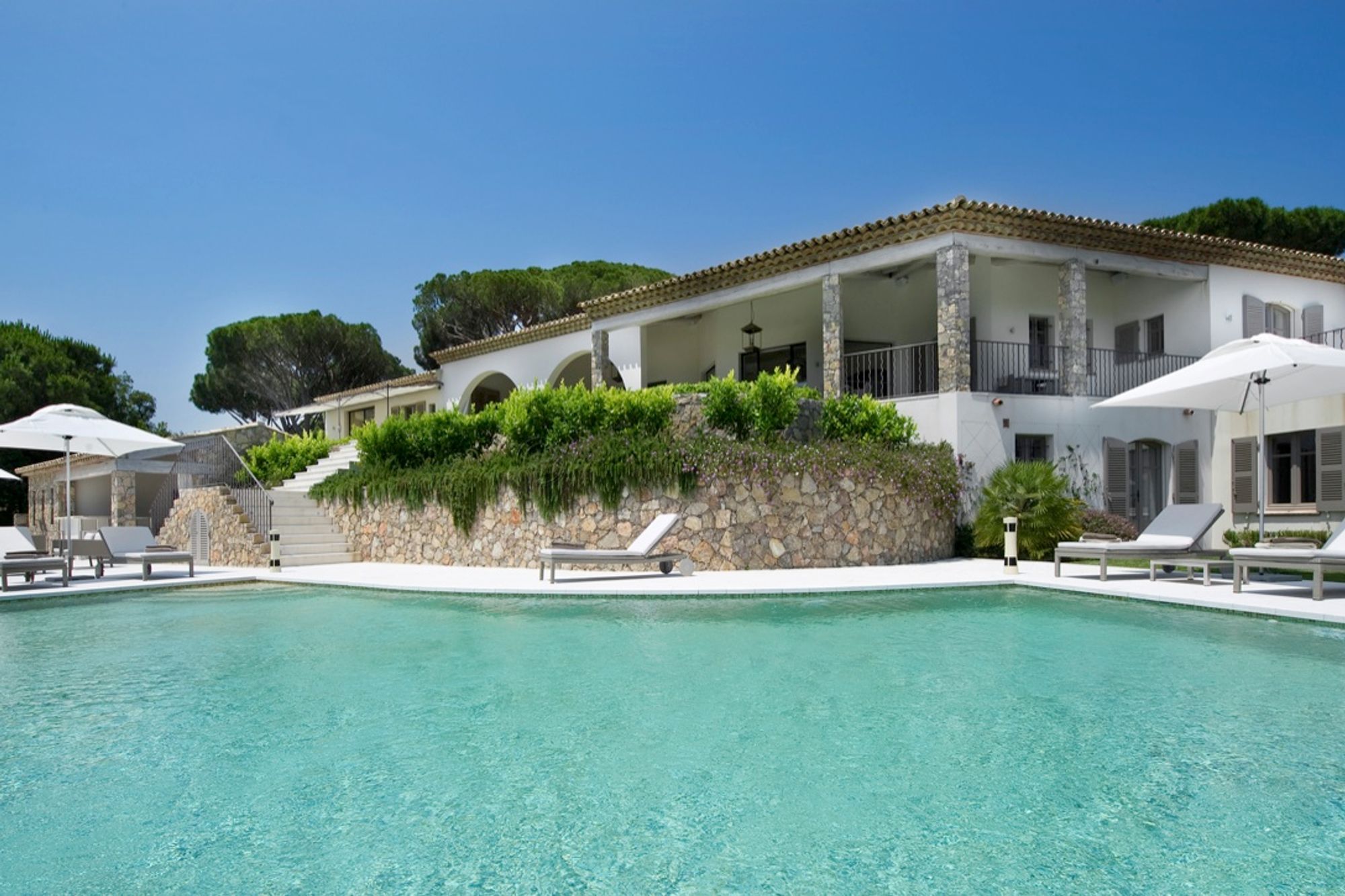 One of the few properties available on the rental market in the sought after area of Bellevue in Saint Tropez, offering great views over the Canoubiers bay and a close distance to the village/beaches. A newly built provencal style property (completed in 2008) set in manicured grounds and benefiting from a full South exposure. Entrance level: Large entrance hall, dining room, equipped kitchen, large living room with a fireplace. Master bedroom with dressing room, en-suite bathroom and private terrace. Two guest bedrooms with en-suite bathrooms and terraces. Study. Pool level: Two bedrooms with en-suite bathrooms and large dressing rooms. Garage for two cars. Laundry room. Overflow swimming pool, pool house with summer kitchen, lounge, bathroom and toilet. floor heating and air conditioning.