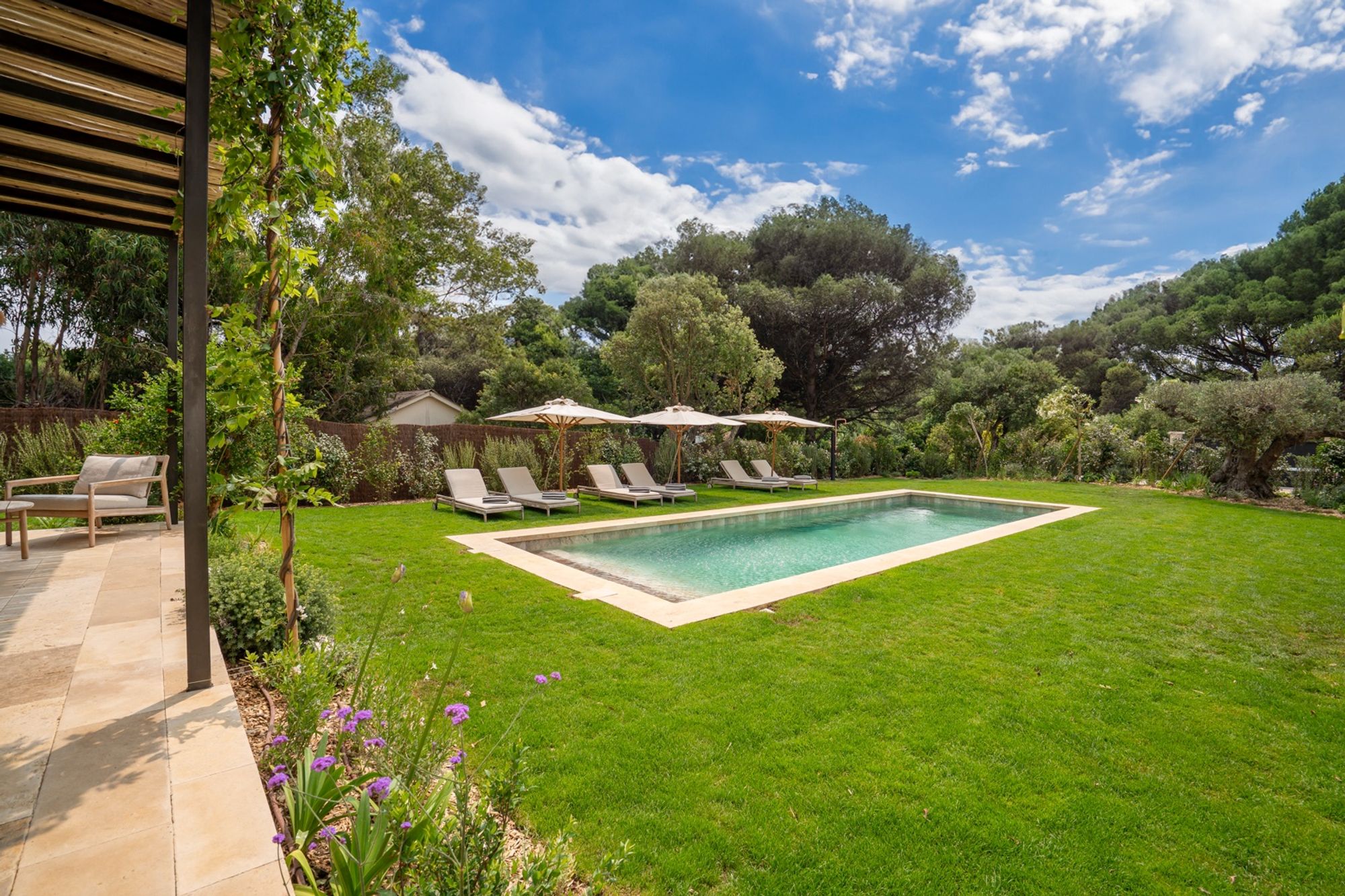 Situated on a private road with restricted access during peak summer hours, the villa offers an exclusive sanctuary of peace and privacy, while remaining just a short stroll from the iconicClub 55andPampelonne Beach.