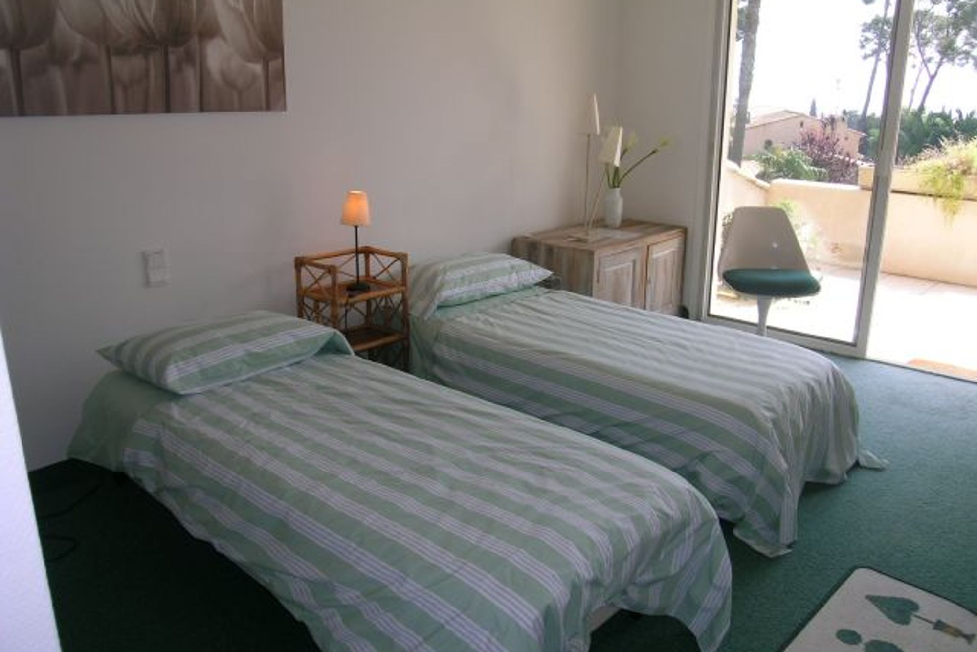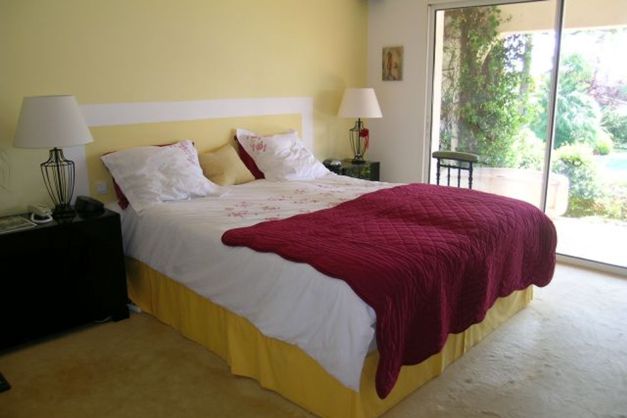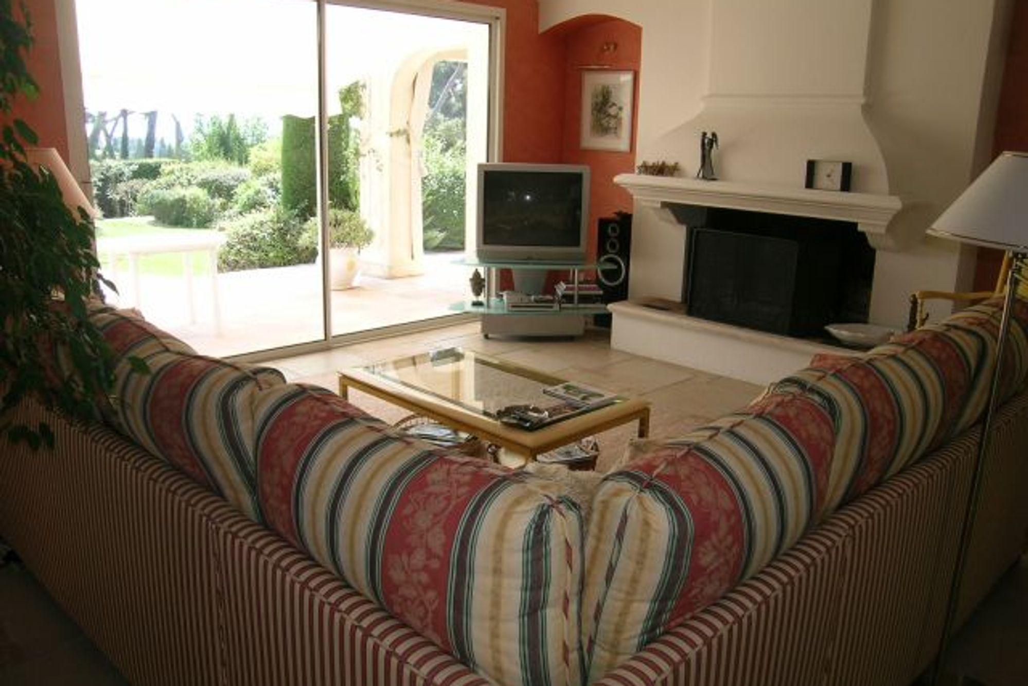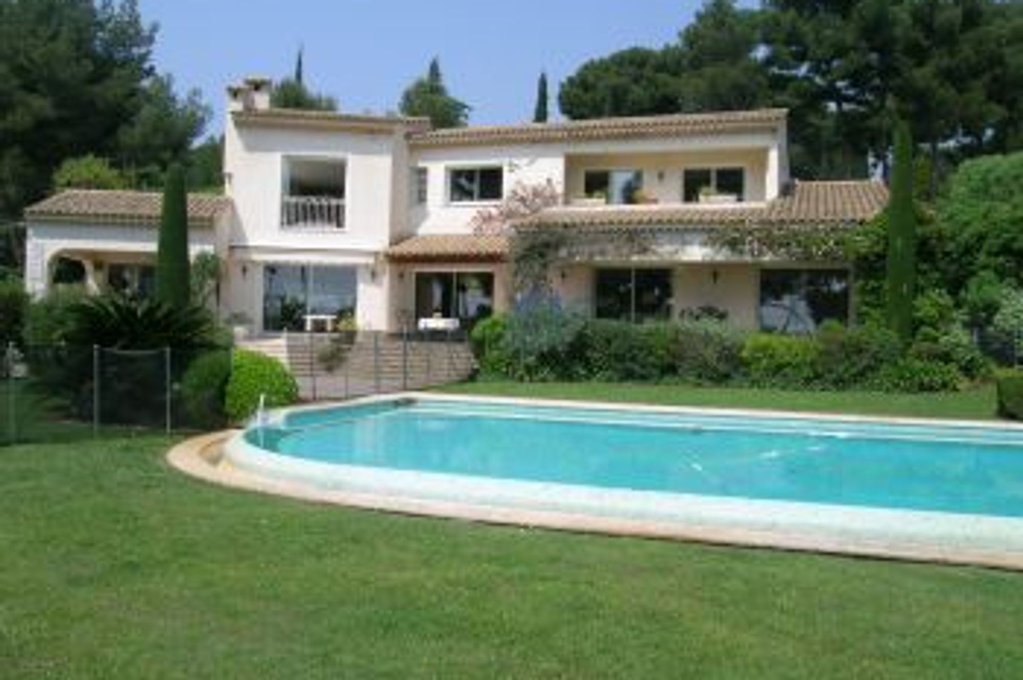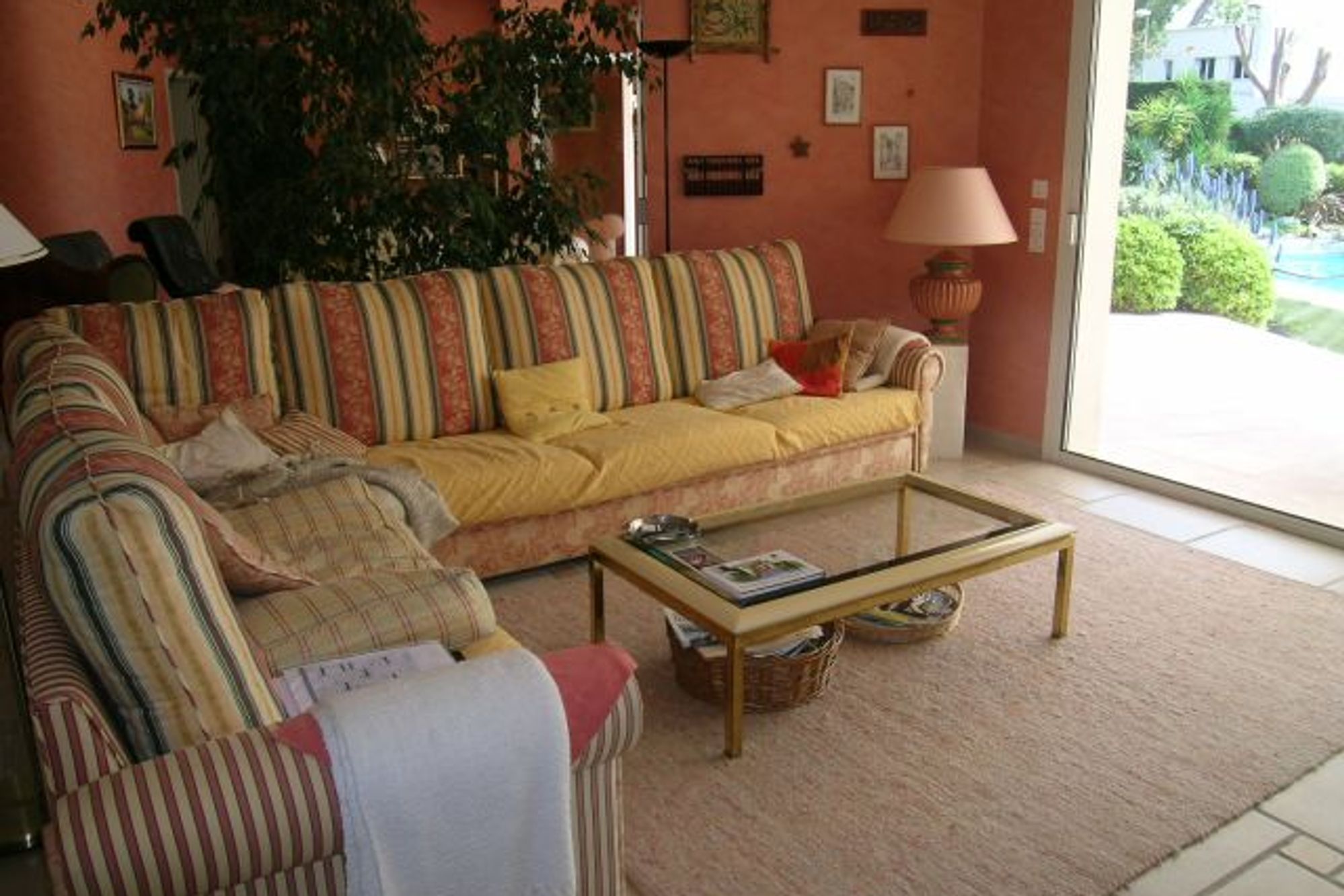 Great villa with 400 m² of living space, located in Juan les Pins in a private domain, with nice sea views overlooking Cannes, the Cap d'Antibes and the islands of Lerins. Only 7 km away from the centre of Cannes and 4 km away from the centre of Antibes. The villa is made up of a large living room and dining room, a study, a fully equipped kitchen leading onto a spacious terrace with BBQ and two extra outside dining areas. A master ensuite bedroom with Jacuzzi on the ground floor. Three bedrooms, one bathroom and two shower rooms on the first floor. A large room with sofa bed, small kitchen terrace and solarium. Swimming pool. Lovely garden.