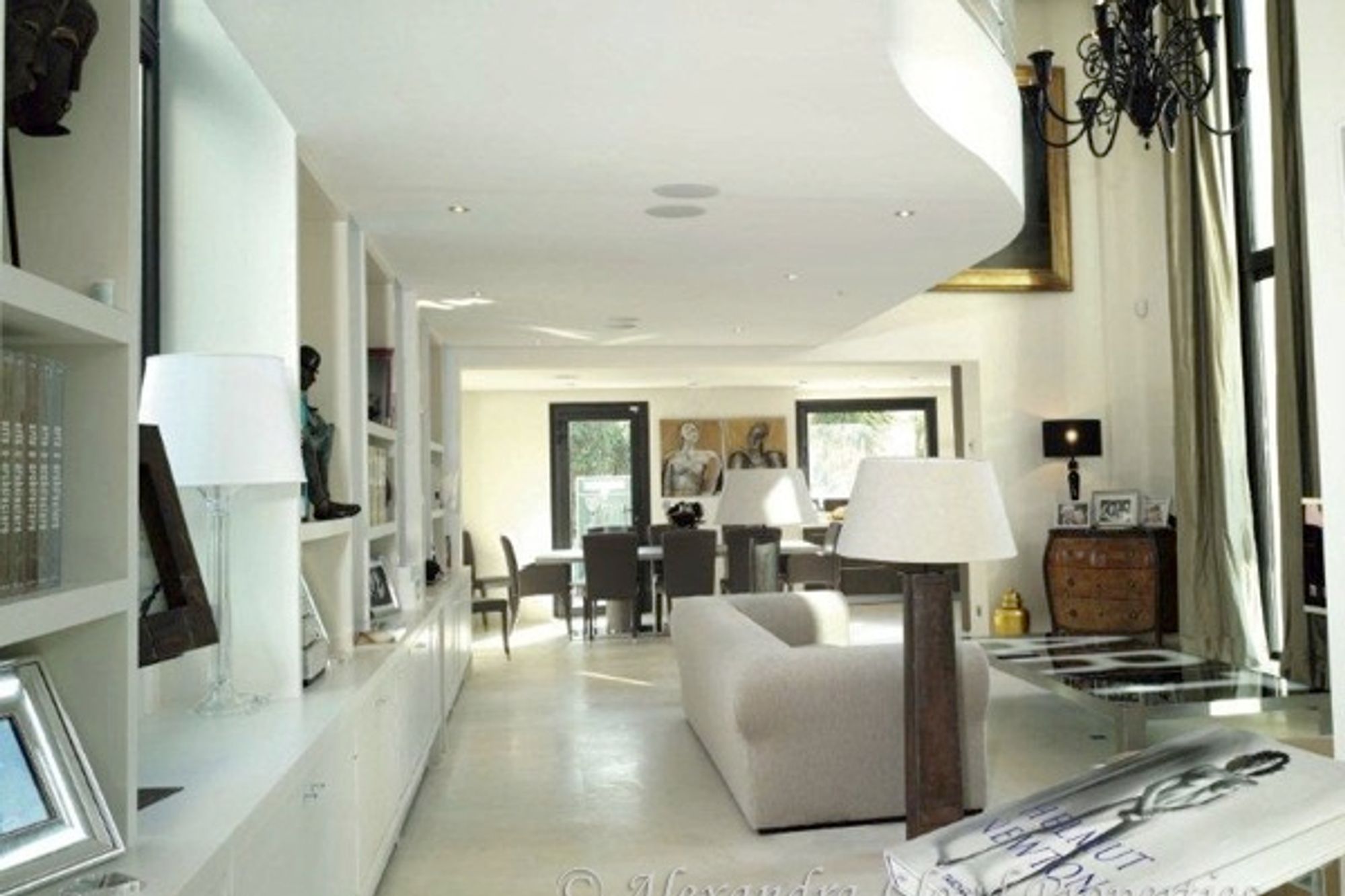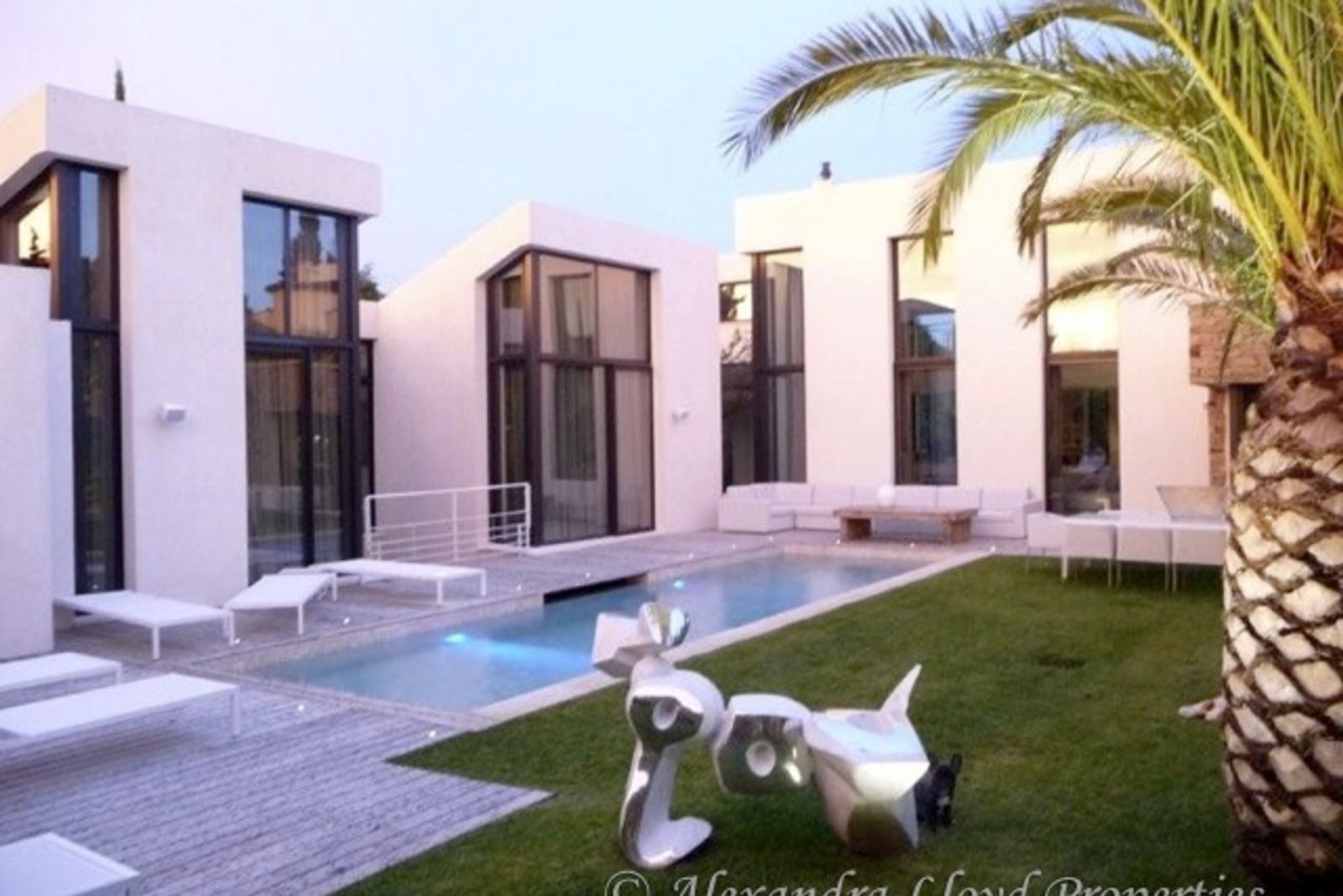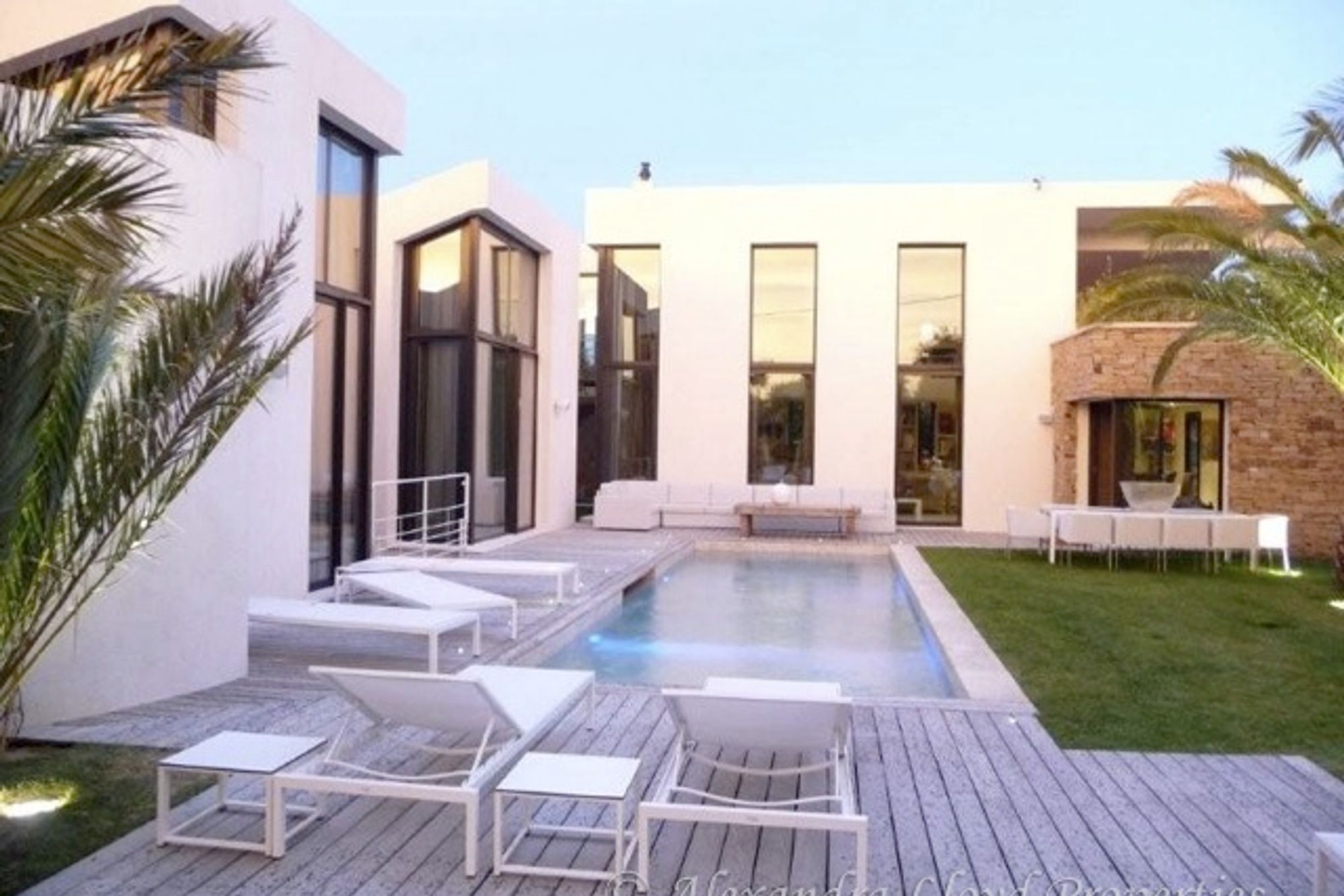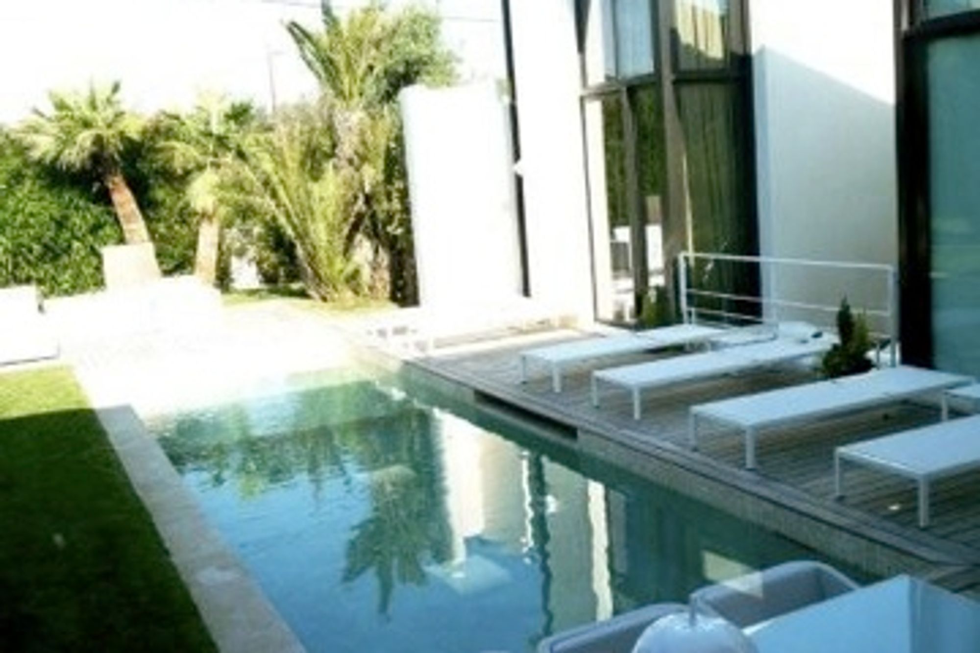 Modern house walking distance to the village of Saint Tropez. A charming well manicured garden, with a lawn, palm trees, and a summer living room around the swimming pool. Garden level: Entrance, guest toilets. Large open living room with large bay windows overlooking the swimming pool. A mezzanine which serves as an office area, with a small terrace. Fully equipped kitchen with a large dining table. Exterior dining room. Two double bedrooms with either shower or bathrooms, leading to the terrace or the swimming pool. Ground level: One large master bedroom, double dressing room (separated), private terrace, bath and shower room. Two double bedrooms with shower rooms, leading onto the patio with water walls.Heated swimming poolsize 12 x 3.5 m.