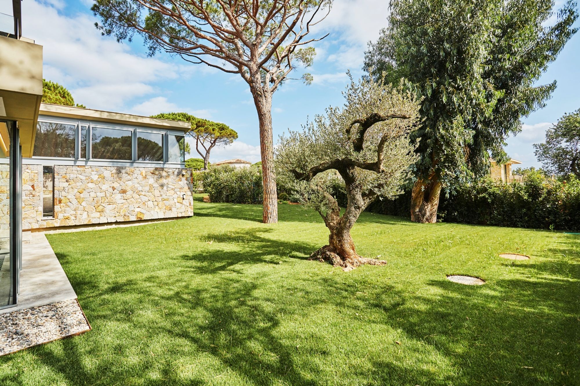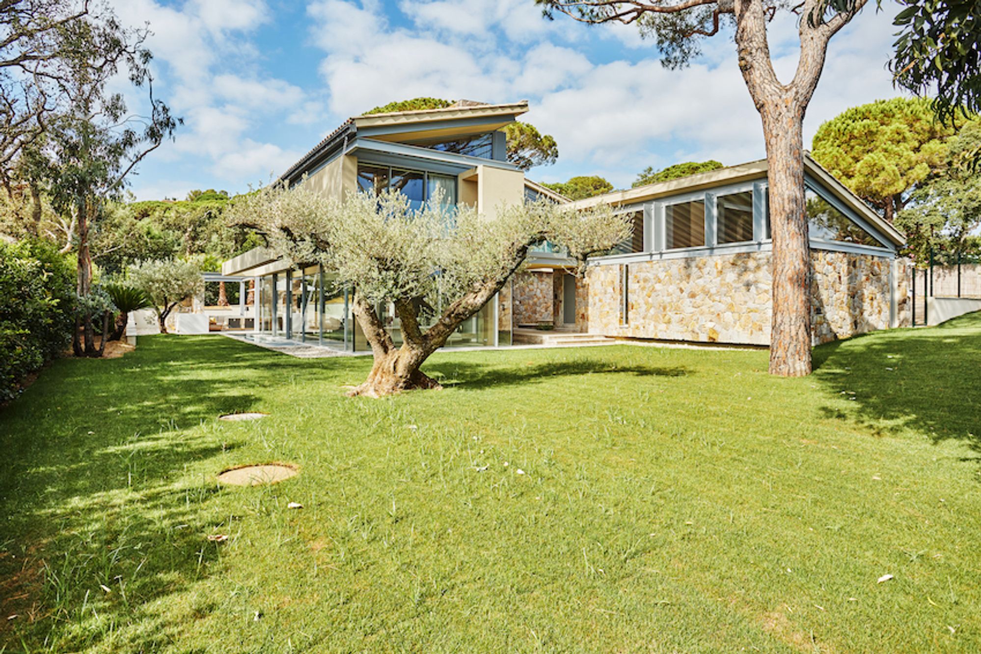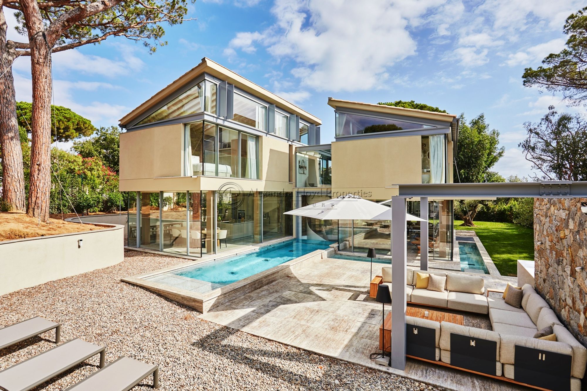 Set within the prestigious Parc des Salins, this ultra-modern villa unfolds across three levels with a seamless indoor-outdoor flow that feels immediately at ease with its surroundings. The first level centres on an open living area with sofas and lounge space, a fully equipped kitchen and a dining area, with a guest toilet. From here, the villa opens onto an outdoor dining and summer lounge area, a private heated swimming pool with sun beds and parasols, a lawn and a barbecue — around 80m² of outdoor entertaining space in total.