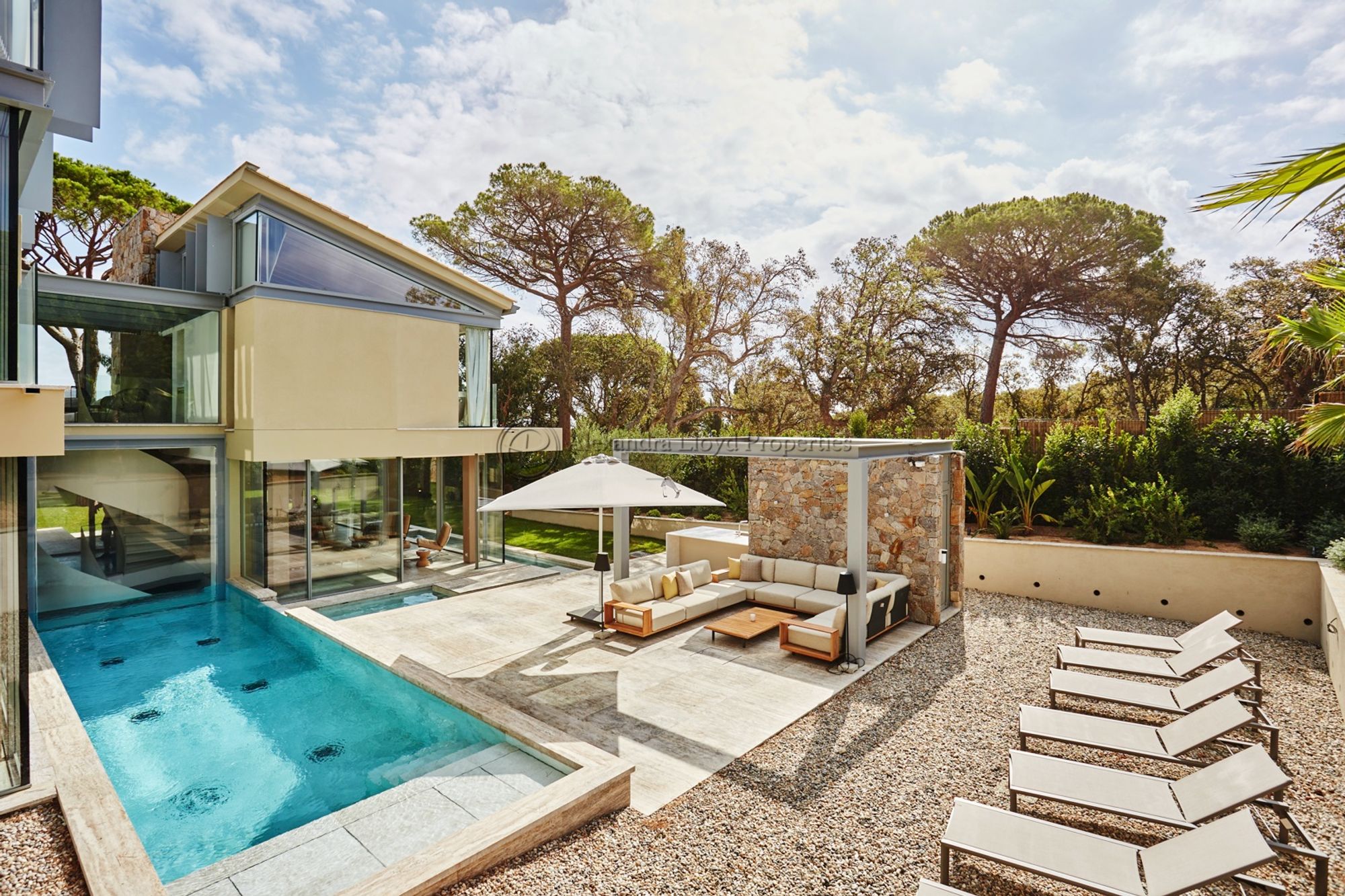 Private heated swimming pool with sun beds and parasols