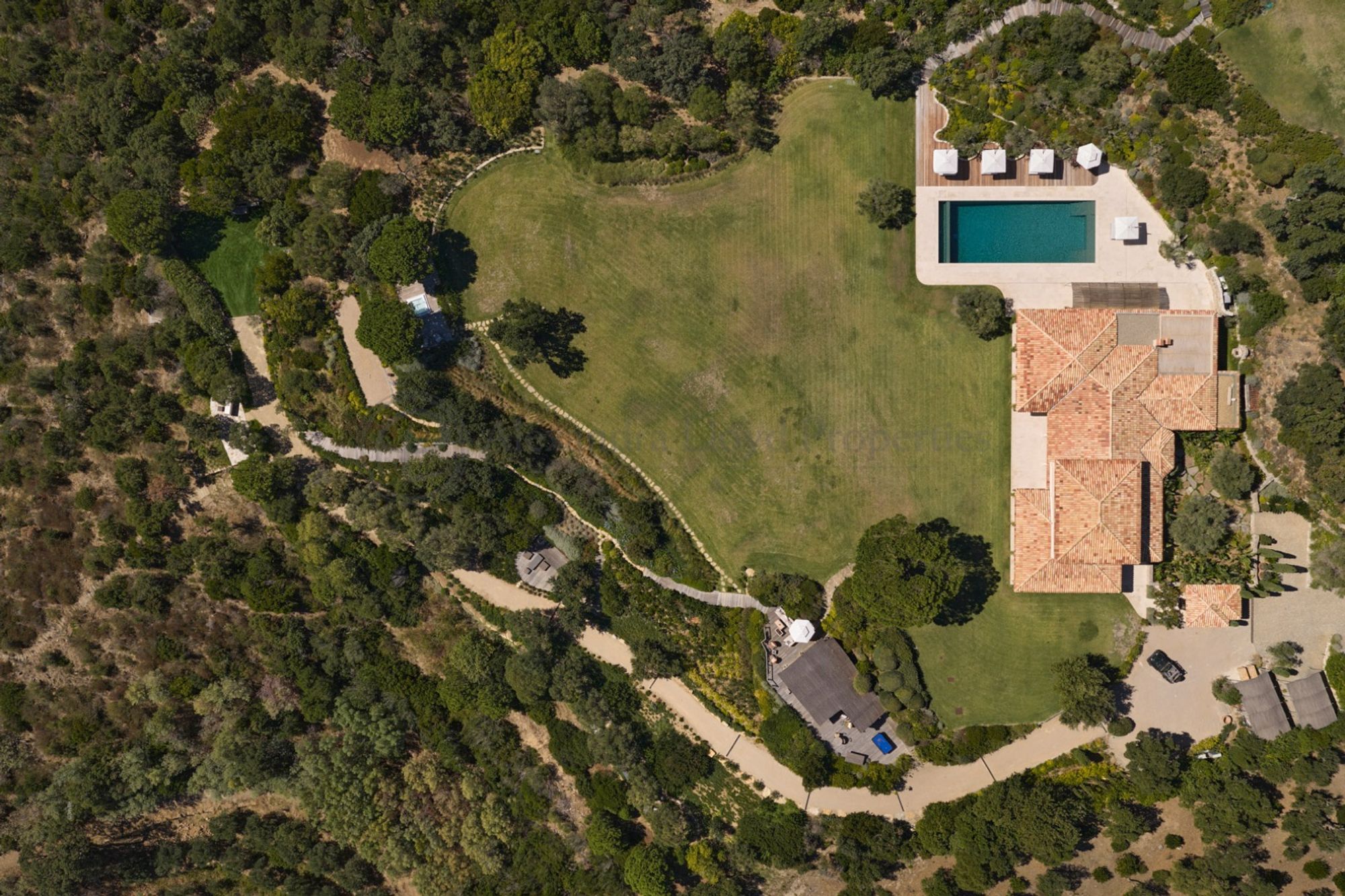 A sixth bedroom, located at pool level and separate from the main house, provides a more independent and relaxed setting with its own shower.