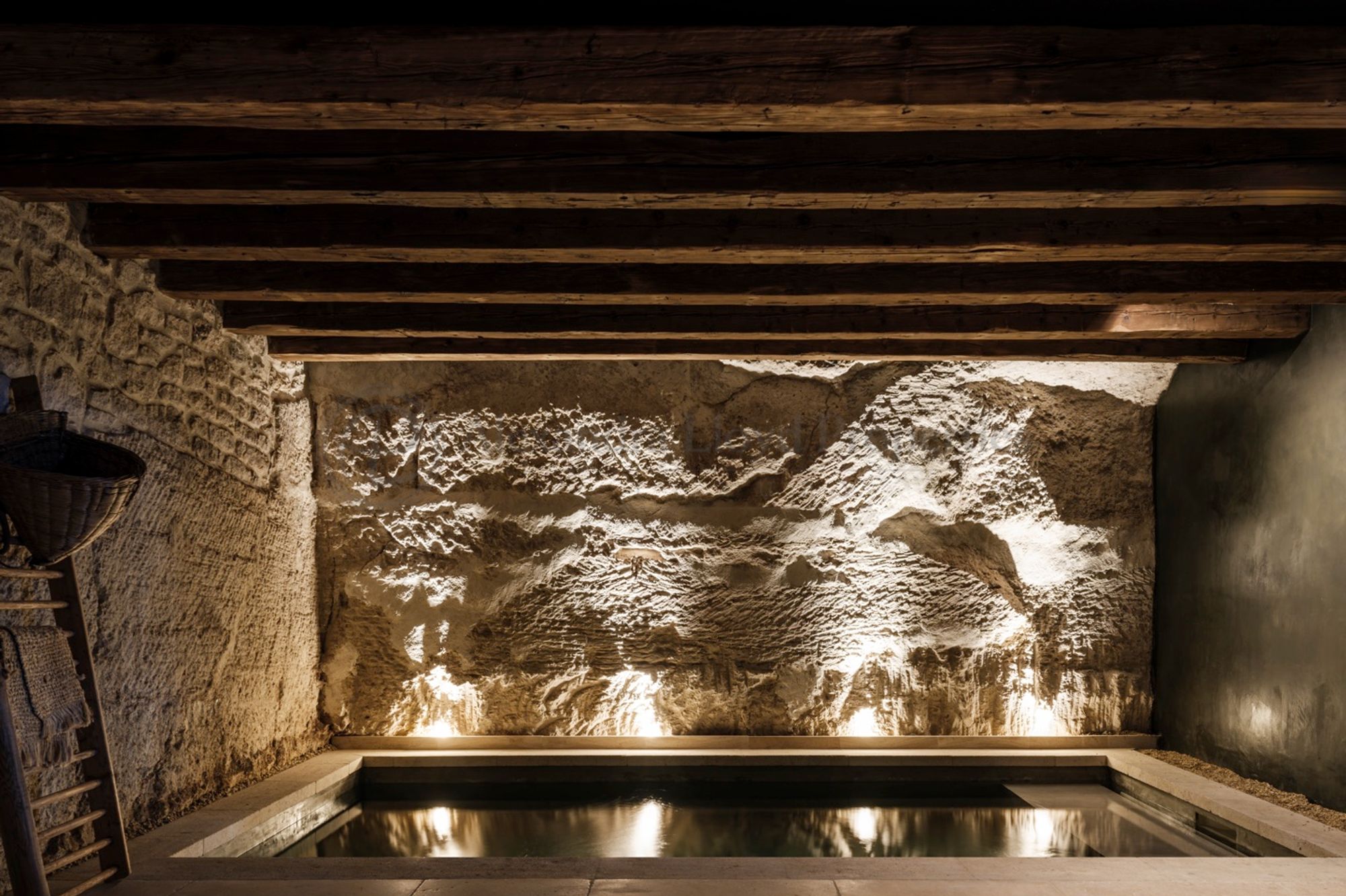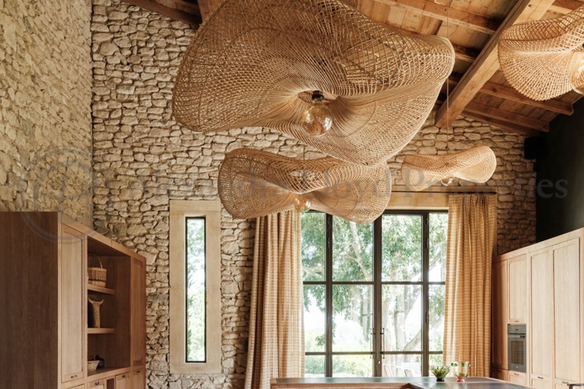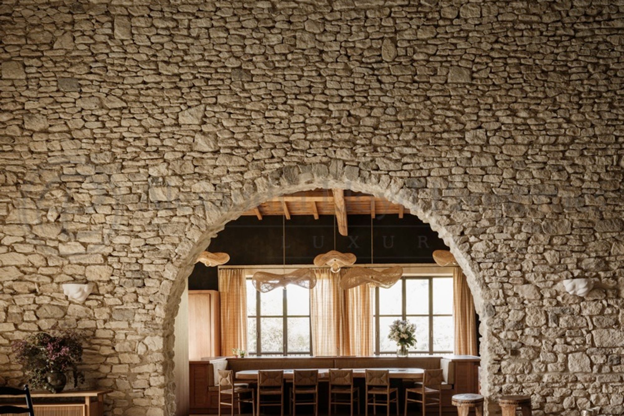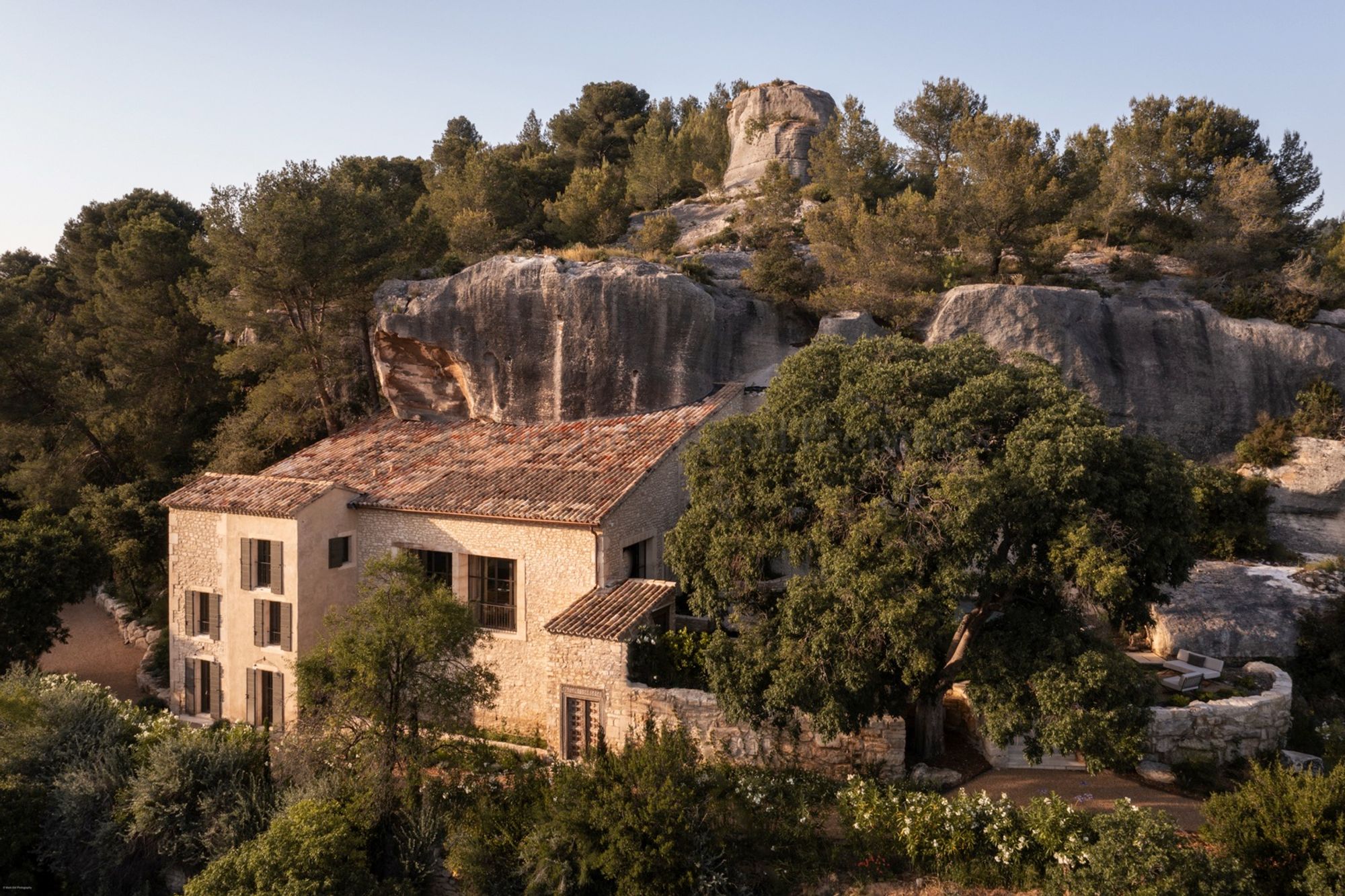 Set at the foot of the dramatic limestone cliffs surrounding Les Baux-de-Provence, this former shepherd’s shelter has been meticulously transformed into a refined private residence. Carved directly into the rock and discreetly integrated into its surroundings, the property offers approximately 350 m² of living space across three levels, within a landscaped garden of 3,000 m² in the heart of the Alpilles. The renovation preserves the authenticity of the original structure while introducing a contemporary architectural approach based on natural materials and traditional craftsmanship. Stone, lime plaster, antique wood and handmade ceramics create interiors that are both understated and elegant, designed to reflect the landscape and heritage of Provence. The house accommodates up to ten guests across five bedrooms, each with its own en-suite bathroom, including two spacious master suites. All rooms are air-conditioned and designed to maintain a strong connection with the outdoors, with views over the surrounding rocks, gardens and the Alpilles landscape. The property offers a full range of amenities designed for comfort and relaxation, including a sauna, a heated indoor swimming pool and a heated outdoor swimming pool. Several terraces extend the living spaces outdoors, with areas arranged for dining and relaxation, featuring a brazier, a Kamado barbecue and outdoor furnishings. Inside, the living areas are defined by natural textures and carefully curated pieces. Whitewashed mineral-toned walls, stone floors, bespoke lighting and handcrafted ceramics create a calm and harmonious atmosphere. The main lounge is centred around the monumental rock formation that shapes the interior space, giving the room the character of a contemporary stone grotto. The kitchen is fully equipped for both private use and professional catering, featuring a Lacanche range cooker, ice machine and complete appliances. A large custom dining table provides an elegant setting for shared meals.