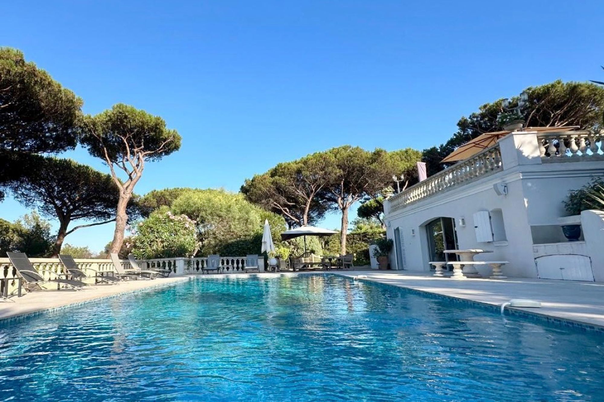 Surrounded by century-old olive trees and umbrella pines, the home includes daily housekeeping, air conditioning, and a high-end outdoor sound system.