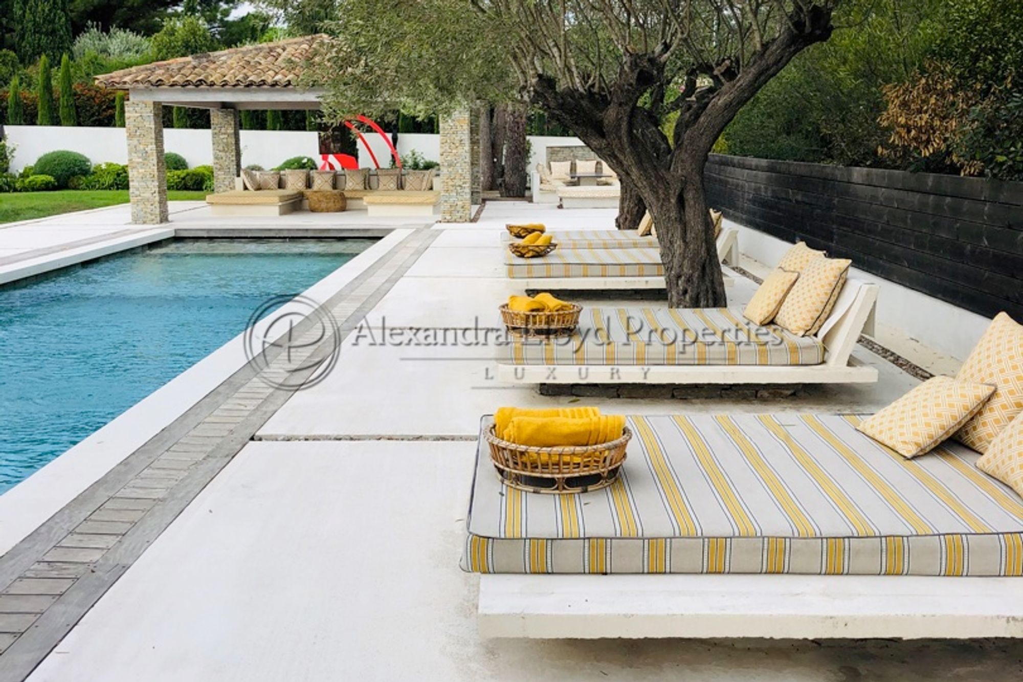 A lovely Bali inspired garden with two heated swimming pools, two pool houses and outside living rooms.